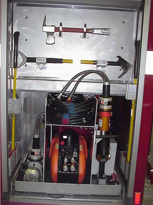 Paratech Pry Axe 30" Plaster Hook w/ D-Handle Pick Head Axe Flat Head Axe Homatro Power Unit Medium Ram Combination Tool (2) 20-ft. hydraulic hoses 1 gal. hydraulic fluid