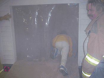 | Crest Firefighter Keith O'Neill reminds children to "Stay Low in Smoke" as they enter the Wildwood Crest Fire Company's "Smoke House", a miniature building filled with non-toxic smoke, used by our firefighters to train children how to react if they find themselves in a smoke-filled