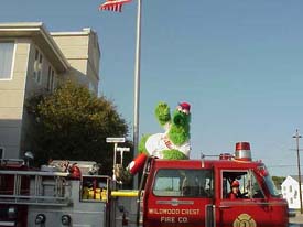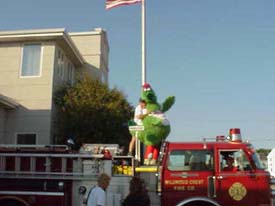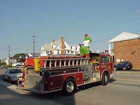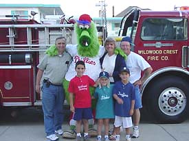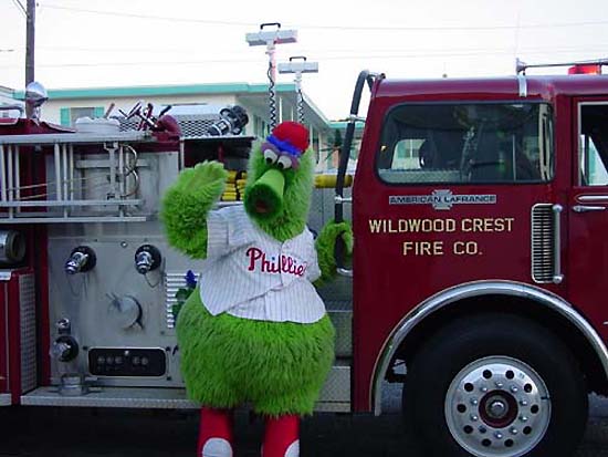 Phillie Phanatic appeared at the Greater Wildwood Little League T-Ball Awards Ceremony on Tuesday, July 31, 2001! What better way to get to the ball field than on top of a fire truck! |