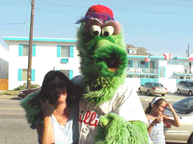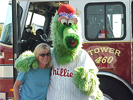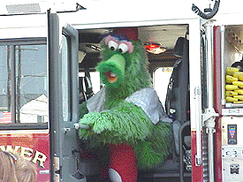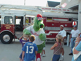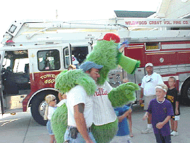 Phillie Phanatic again appeared at the Greater Wildwood Little League Awards Ceremony on Wednesday, July 31, 2002! This year, Phanatic rode to Higbee Field on the top of Tower 460! SEE LAST YEAR'S PHOTOS |