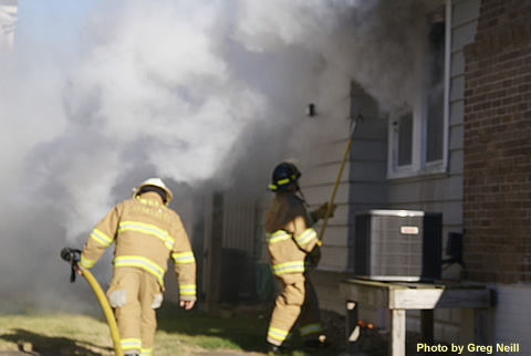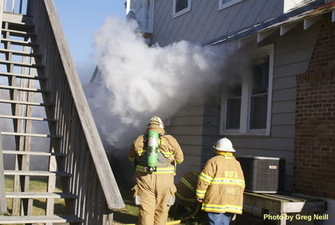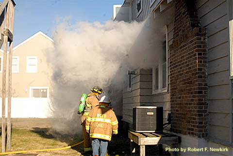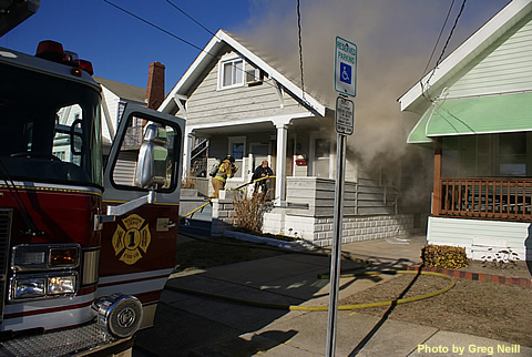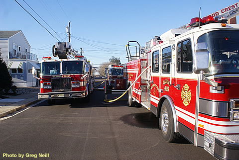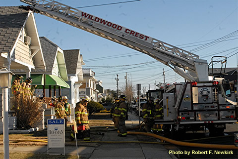 January 1, 2009 - New Years Day House Fire - 146 p.m.: The company was dispatched for smoke coming from the building at 111 E. Wisteria Rd. Upon arrival crews found a working room and contents fire on the 1st floor of a 1-1/2-story unoccupied dwelling. Quint 439's crew effected a quick knockdown as E438 laid the supply line. Two firefighters suffered minor injuries in falls on icy surfaces, one on a rear exterior stairway (transported by Wildwood Crest Rescue to Cape Regional Medical Center as a precaution) and one on the icy street (treated at the scene). |